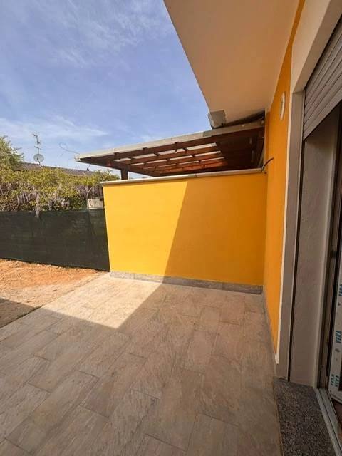 L'ingresso si apre su un ampio soggiorno con angolo cottura affacciato sul giardino privato, in parte pavimentato e predisposto con attacchi per una zona barbecue, ideale per vivere al meglio gli spazi esterni. La zona notte comprende una camera matrimoniale, un bagno principale e due generose camerette, di cui una con bagno privato.