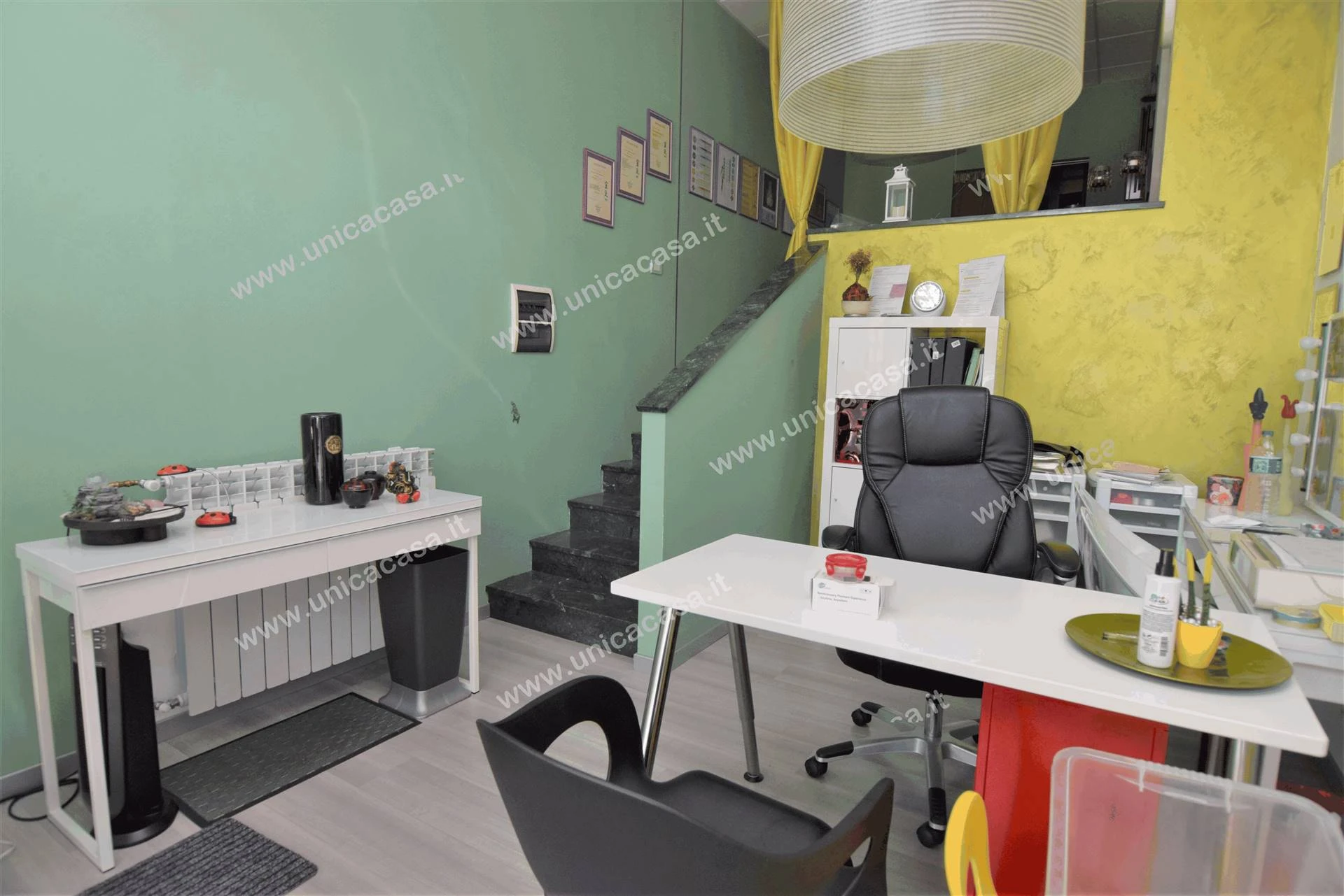 Composto da un ingresso con locale attualmente adibito a studio , le scale che portano in un altro locale soppalcato dotato di un ripostiglio finestrato ed un bagno di servizio.