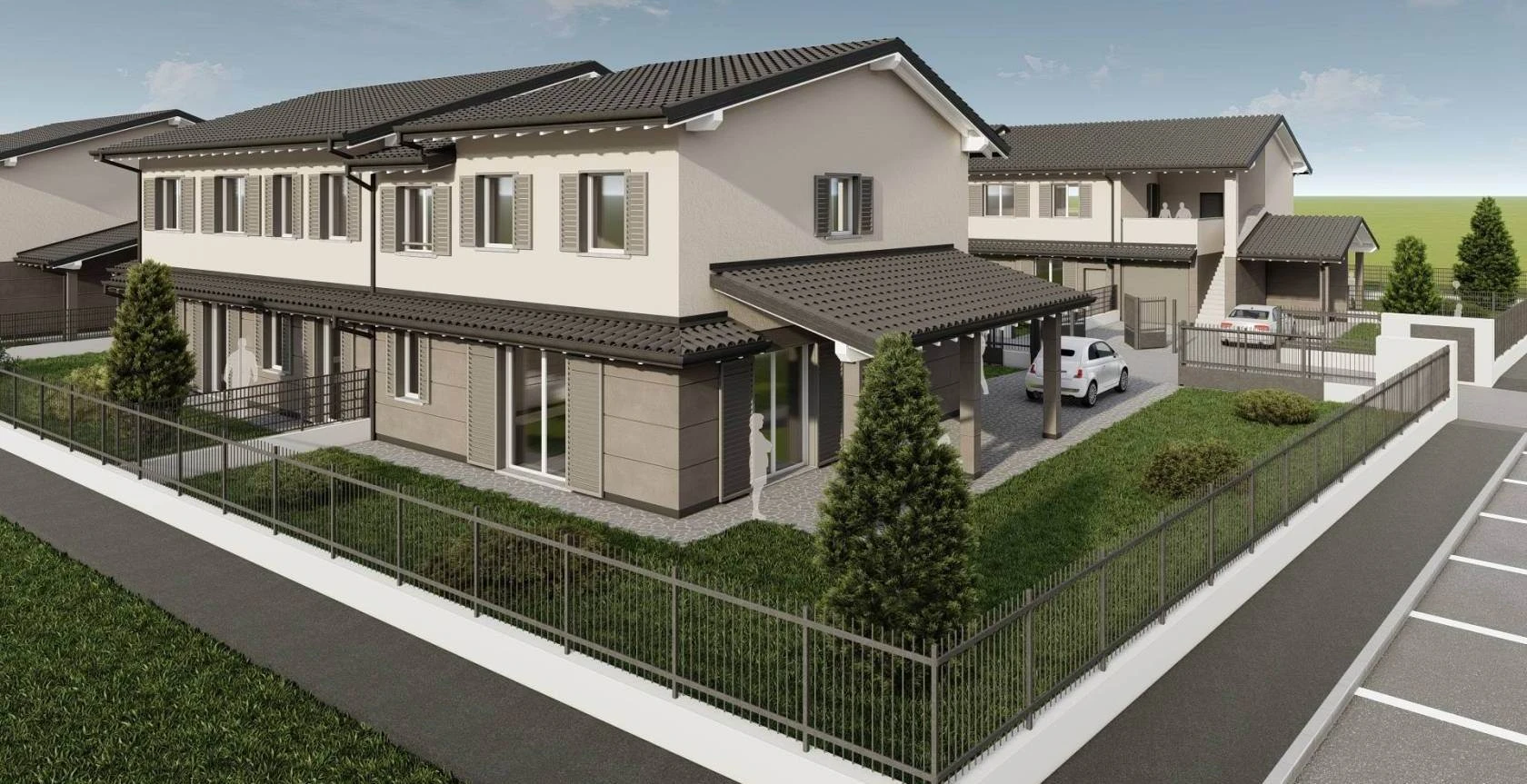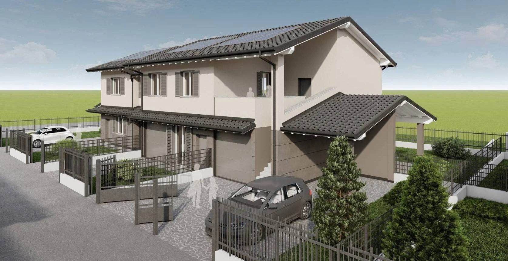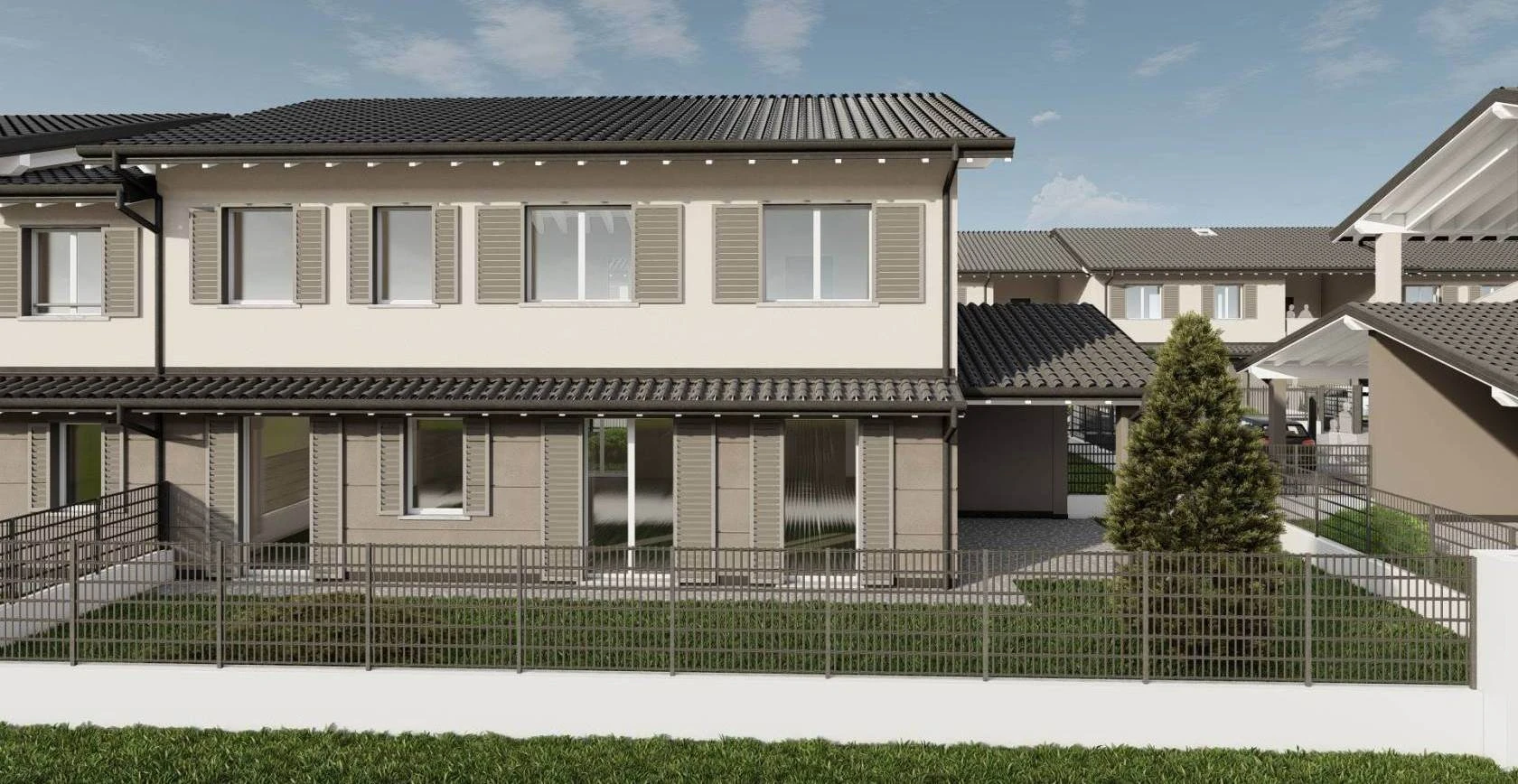 In PROSSIMA realizzazione, in ottima zona residenziale, VILLA laterale libera su tre lati. La soluzione immobiliare è caratterizzata da generosi spazi abitativi. Al piano terra AMPIA zona giorno open space, con accesso diretto al portico riservato di 18 mq, ideale per pranzi e cene all'aperto nelle belle stagioni, disimpegno e bagno. Il giardino di 267mq avvolge la villa. Al piano primo troviamo ben QUATTRO camere da letto, ampio disimpegno, bagno padronale e ripostiglio, adattabile anche come GUARDAROBA o terzo servizio! L'autorimessa è posta comodamente al piano TERRA, che può essere direttamente collegata alla zona giorno.